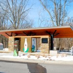 The pavilion, which was constructed by Nabholz, was designed with sustainability in mind and features concrete, native stone, metal, and Cor-ten steel. Vending areas for Coca-Cola beverages are paired with recycling stations, while bench seating is made from recycled PET bottles. Station signage includes a Crystal Bridges trail map, as well as tips for incorporating healthy, active living into a museum visit, such as strolling the Art Trail, wandering the galleries in search of Norman Rockwell’s Rosie the Riveter painting, or hiking the Rock Ledge Trail. There is also information about the important role of recycling. A digital display screen offers viewers museum information, including current exhibition news.