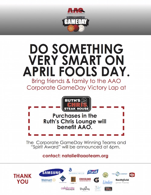 After a day of competition at AAO’s Corporate Game Day, bring your friends & family to Ruth’s Chris Steak House in Rogers for the post-event Victory Lap! The winners of the day’s games will be announced. A portion of the proceeds from Ruth’s Chris Lounge will benefit AAO.
