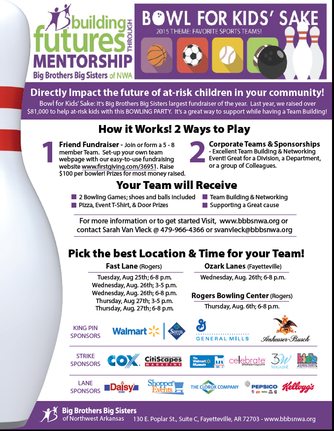 Bowl for Kids’ Sake takes place over multiple nights in August at a number of different bowling alleys in the region. Form your team of five to eight members, raise a minimum of $100 per bowler and join the thank-you party at the lanes. All proceeds go to support mentoring relationships and help children realize their potential and build their futures.