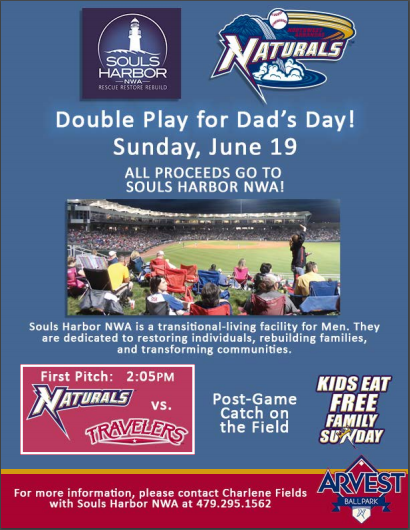 Proceeds benefit Souls Harbor NWA, a transitional living facility for men. Souls Harbor provides food, clothing, shelter, employment and education opportunities free of charge. By purchasing a ticket for Double Play for Dad’s Day you will allow a resident and his children/grandchildren to attend a Naturals baseball game on Father’s Day.
