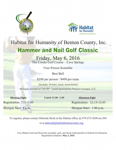To register, please contact Deborah Stock at 479.273.3638 ext 204 or at deborah@habitatbentoncounty.org.