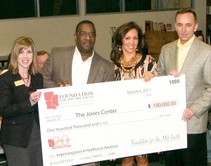 Kelly Kemp-McLintock accepts a $100,000 check from Paul Davis, Vice Chair of the Board of Directors of the Foundation for the MidSouth and a Vice President at Tyson Foods.  Also accepting are Tina Hodne, Immediate Past Chair of the Board of Directors of The Jones Center and a realtor at Coldwell Banker Harris McHaney & Faucette and John George, the current Council Chair of The Jones Center’s Development Council and Executive Vice President at Hunt Ventures.  The check presentation took place on Friday, March 4th at The Jones Center in Springdale.  Proceeds from the foundation will be used to support youth services, health education and education activities at The Jones Center.